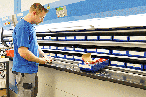 Unsere beiden Schlüssel-Paternoster (liftähnlich rotierende Lager-Systeme) gehen über zwei Stockwerke, sind jeweils etwa 9 Meter hoch und bieten Platz für ca. 1 Million Schlüssel-Rohlinge und ca. 6000 verschiedene Schlüsselpositionen. Das sind 20 Tonnen Material, die wir beständig auf Lager haben. Schnelle Lieferung ist also kein Problem. Und weil das Schlüssellager über eine computergesteuerte Automatik und Verwaltung verfügt, wird jeder Rohling sehr schnell gefunden und ausgegeben.